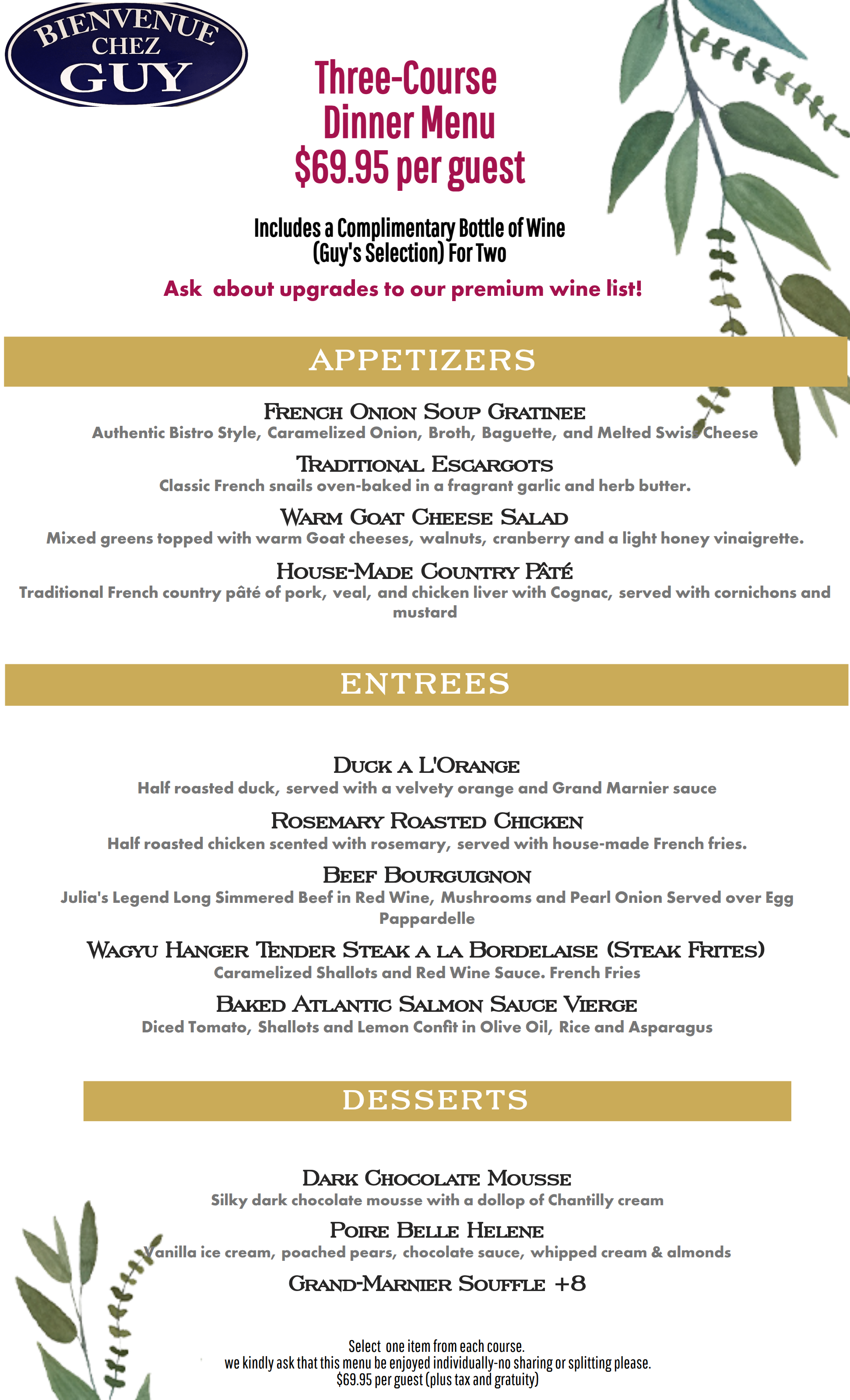 Our 3-Course Menu will not be available on Valentine’s Day ~ Please see our Valentine’s Dinner Menu