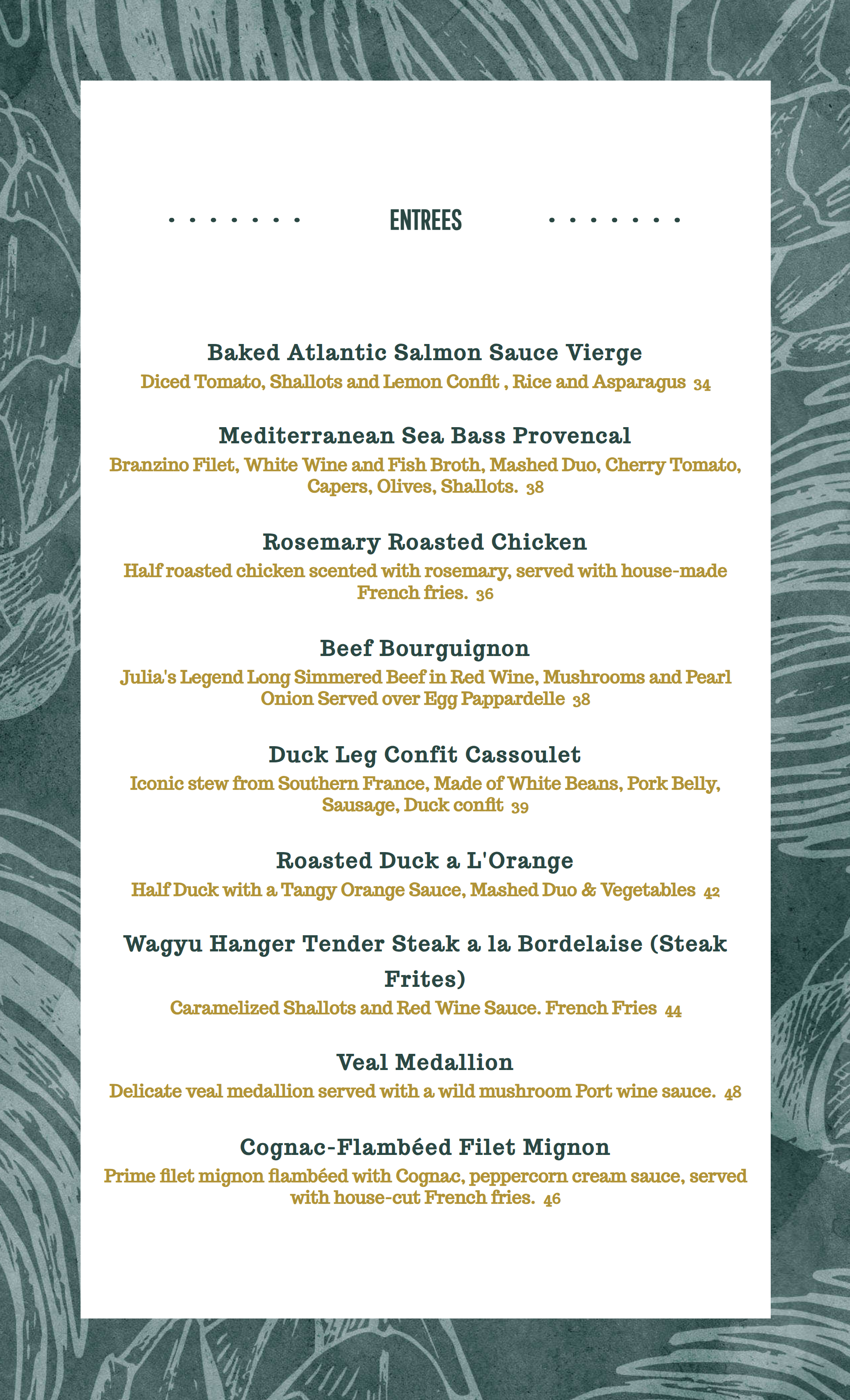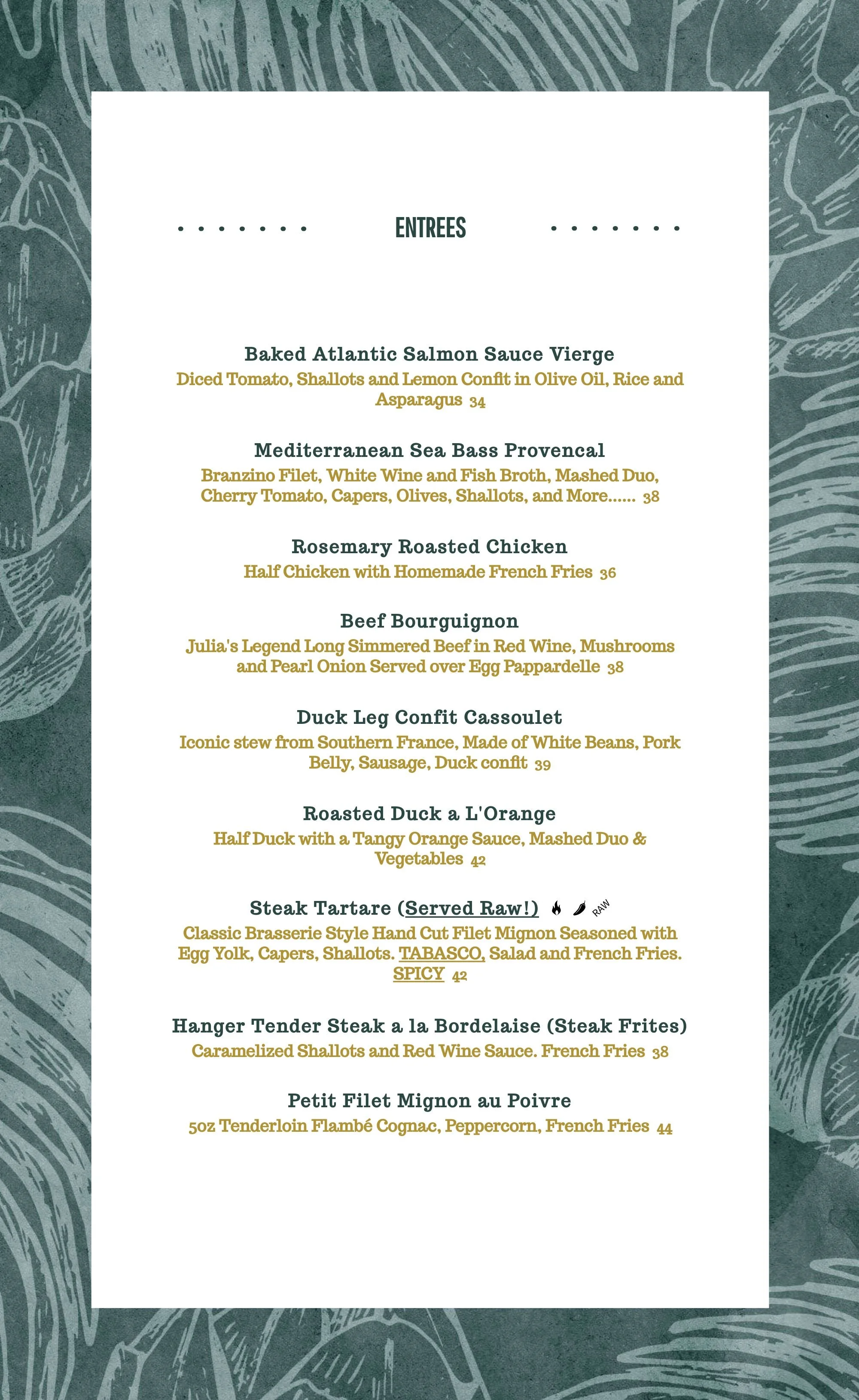 Classic French fare served in a cozy, romantic setting. Chez Guy Parisian Bistro - Dinner Menu